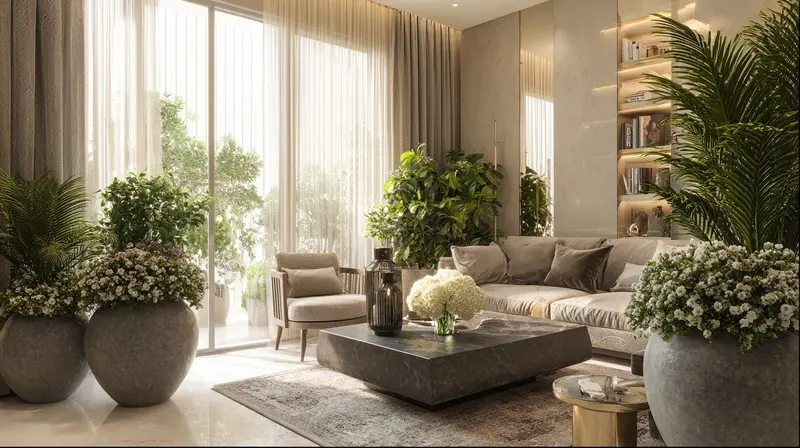 В гостиной, как в центре дома, будут уместны масштабные решения. Поставьте высокое напольное кашпо (высотой 60-80 см) с фикусом лирата рядом с диваном для создания сильного визуального акцента. На комоде организуйте группу из трех горшков разной высоты, объединенных общим материалом, что добавит им динамики. Дополнительные подставки помогут создать многоуровневую композицию даже на ограниченной площади.